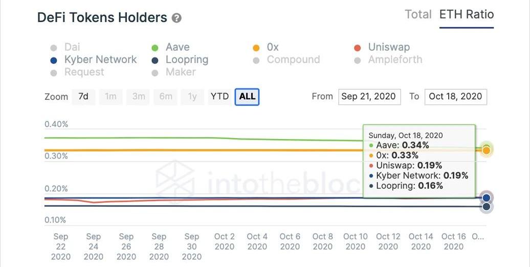來源:IntoTheBlock’sYFIfinancialindicators上圖顯示,在15170美元的價格下,YFI持有者的數量從5.97萬下降到只有1.63萬。這表明,在“紙面”上獲利的人很可能決定在價格較高時平倉。其他治理Token,如SNX,LEND和UMA也顯示出同樣的模式。最終,這凸顯了投資者在DeFiToken的拋物線反彈后如何選擇獲利并平倉。對于DeFi這樣的新興市場來說,經歷這種類型的價格波動是正常的,尤其是在加密領域。放眼望去,Ethereum上的DeFiToken仍然微不足道:目前它們占加密貨幣總市值3650億美元的1.39%。從持有者的數量來看,DeFiToken占據的市場份額更小。