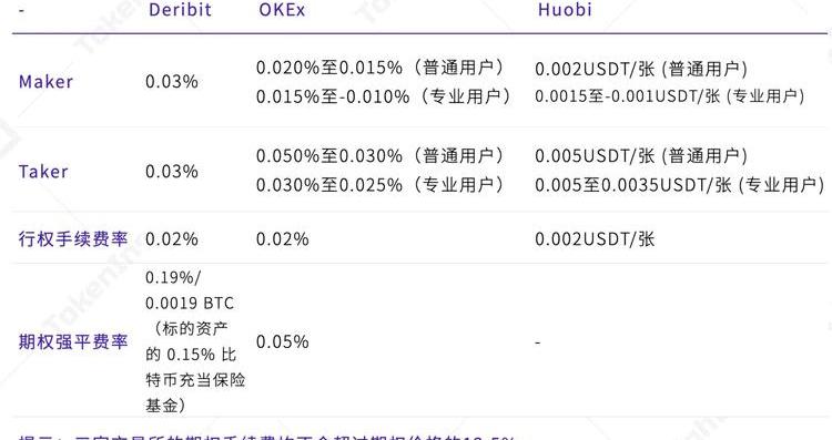 Huobi做市商計劃細則,來源:HuobiFutures3.3.8手續費具備相對優勢為Huobi的交易費用也是一個亮點,Huobi選取的方式是按單張合約收取固定價格的手續費用,一方面,由于單張期權的手續費固定,在交易權利金較高的期權合約時,手續費會有不小的優勢。另外每筆交易的手續費有上限,不超過支付或收取的權利金的12.5%。看漲期權交割手續費為對應的幣種,采用計價幣種USDT估算,并用交割價折算為對應幣種數量,從交割收益中扣除,若投資者的交割收益為負,則不收取。相對于其他交易所,Huobi的虛值期權和平值期權到期自動失效,無需行權交割手續費,只收取實值期權買方交割手續費,而賣方則無需支付行權交割手續費。