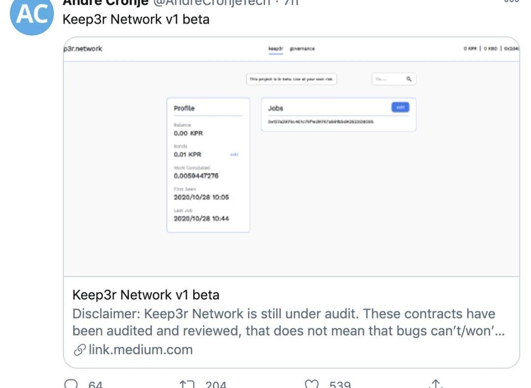 昨天AC發了一條推特,Keep3r網絡測試版上線。
