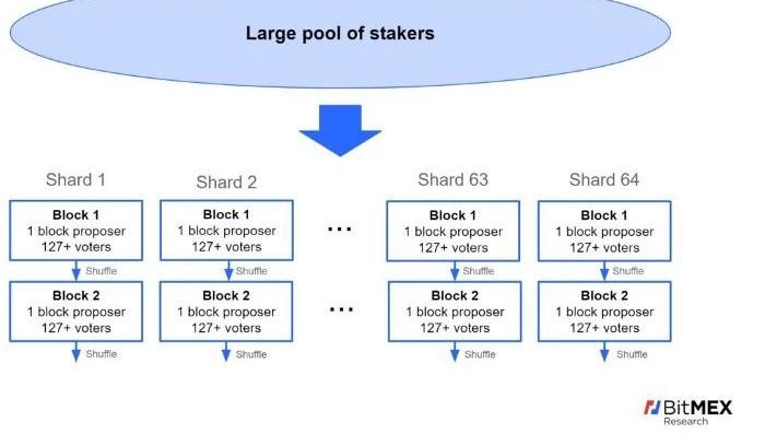 圖片來源:BitMexResearch藍色箭頭代表區塊的哈希值,每一個區塊中都必須包含這個哈希值。灰色箭頭代表交叉引用的分片,不一定包含在信標區塊中,如圖右側所示。在第一階段,分片系統和質押過程變得相互交織。從0階段開始的槽位的驗證者委員會以分片的形式顯示。每個分片都有自己的投票選擇委員會,該委員會在擬議區塊的每個"委員會期"中都會發生變化。同樣,在信標鏈中,一個委員會成員被分配了在指定時間段產生一個區塊的任務,而其他委員會成員在那個時間段對每個提案進行投票。關鍵因素是當信標鏈通過交叉引用系統引用分片區塊鏈時,所有的投票數據都包含在信標鏈中。在第一階段,質押被隨機分配--要么在信標鏈中,要么在特定的分片中。如果stake包含的ETH少于840萬,則沒有足夠的質押品完全服務于所有的分片,因此分片的工作可能會在一定程度上減緩。下圖表示了一種可能:Staker委員會按分片分配。