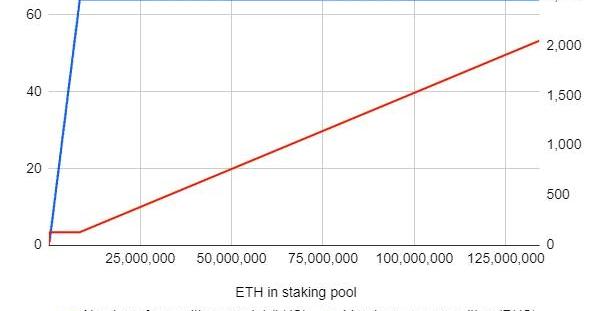 數據來源:BitMexResearch在現實中,事情可能比這些圖中更復雜。所以,在0階段,一個時段最多可以有64個委員會,而不是一個。因此,如果每個委員會有128個成員,那么每個時段最多可以容納262,144個staker,相當于大約840萬ETH。每個Staker被分配到一個委員會。質押的越多,委員會越多。最大的委員會規模是2048個,大致相當于每個epoch使用的全部以太坊供應量。下圖說明了委員會的數量和委員會成員的數量如何隨著質押池中ETH數量的變化而變化。它顯示,隨著質押池的增長,委員會數量首先增加到64個,然后當質押池中約有840萬ETH時,委員會的規模開始增長。委員會的數量和委員會成員的數量。