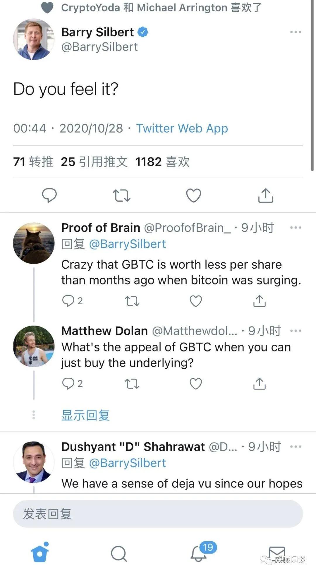 大家應該在各個群里也看到有人在討論說“這個群怎么這么安靜”吧,今年真是不熱鬧,甚至不如312之后四五月份熱鬧,更別提和去年從14000的時候對比了。那時候熱鬧得可怕呢。但是Twitter上倒是挺熱火朝天的,大V們更是“奶紅了眼”,狂奶一通,點贊量也是急劇飆升,我截圖了一些,給大家感受一下國內幣圈外面的,真正的比特幣的輿論世界都興奮成啥樣了:
