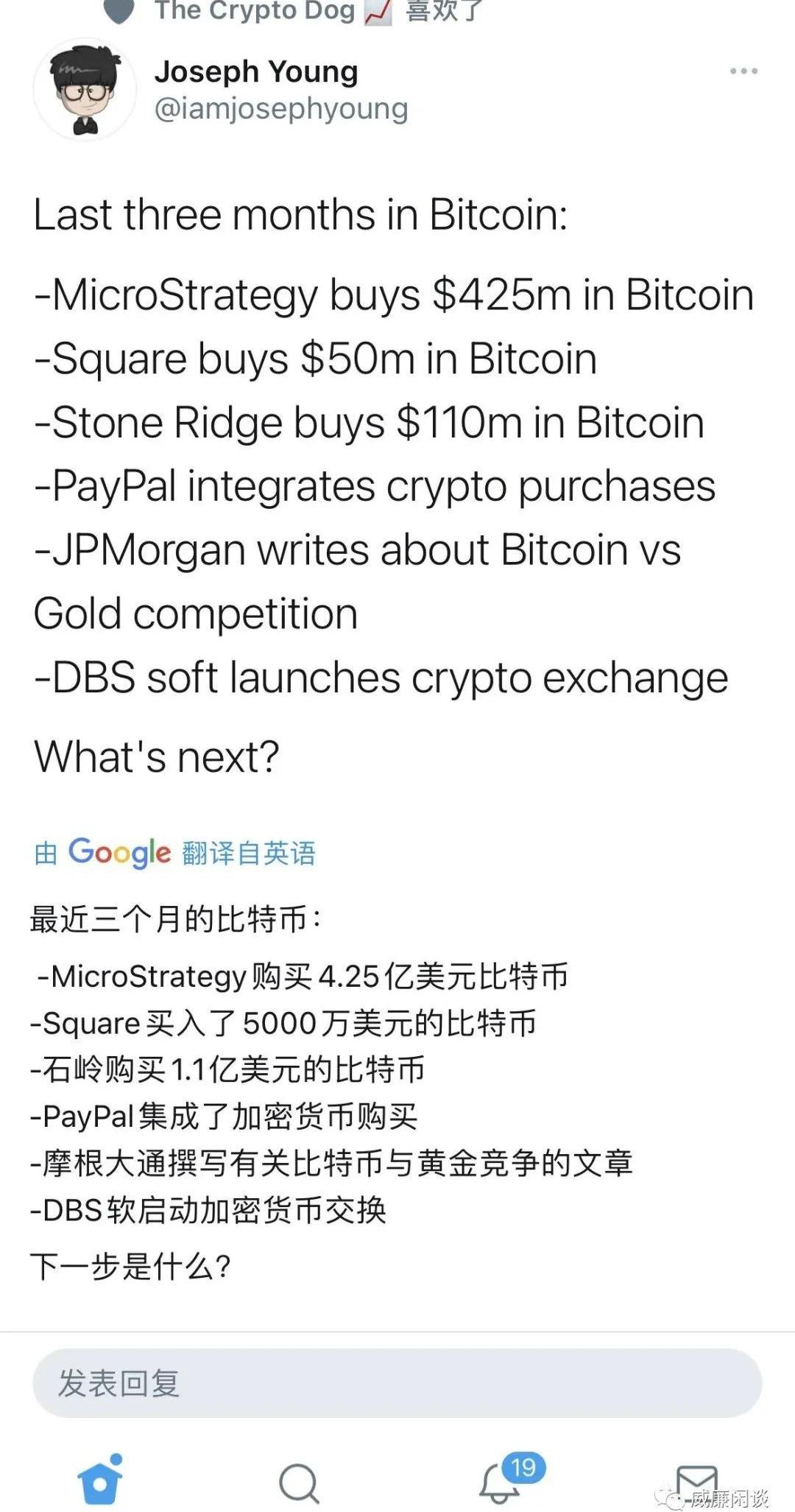 這對于他們的股價來說,應該也會有很大的助力,真正的--又吃又拿。美國企業們或許很快就會跟著真香了。我估計未來的上市公司只要公開宣布買入比特幣作為資產儲備,或者支持加密貨幣相關的東西,就能成為一個利好吧?畢竟今年Microstrategy和PayPal都是宣布之后股價就漲了,十分有趣。所以今年比特幣上漲的紅利,其實真正是被美國人享受到了,散戶、機構、企業等皆獲利頗豐,十分滿足。所謂:美國人的牛市。我現在只喜歡加密貨幣市場對于國內的投資者來說,不會是下一個“美股”就好了,全世界都參與了,只有我們干看熱鬧,那可真是,涼。最后,分享一個國內比特幣投資者的自述,可以看出目前的國內比特幣投資市場輿論環境了..