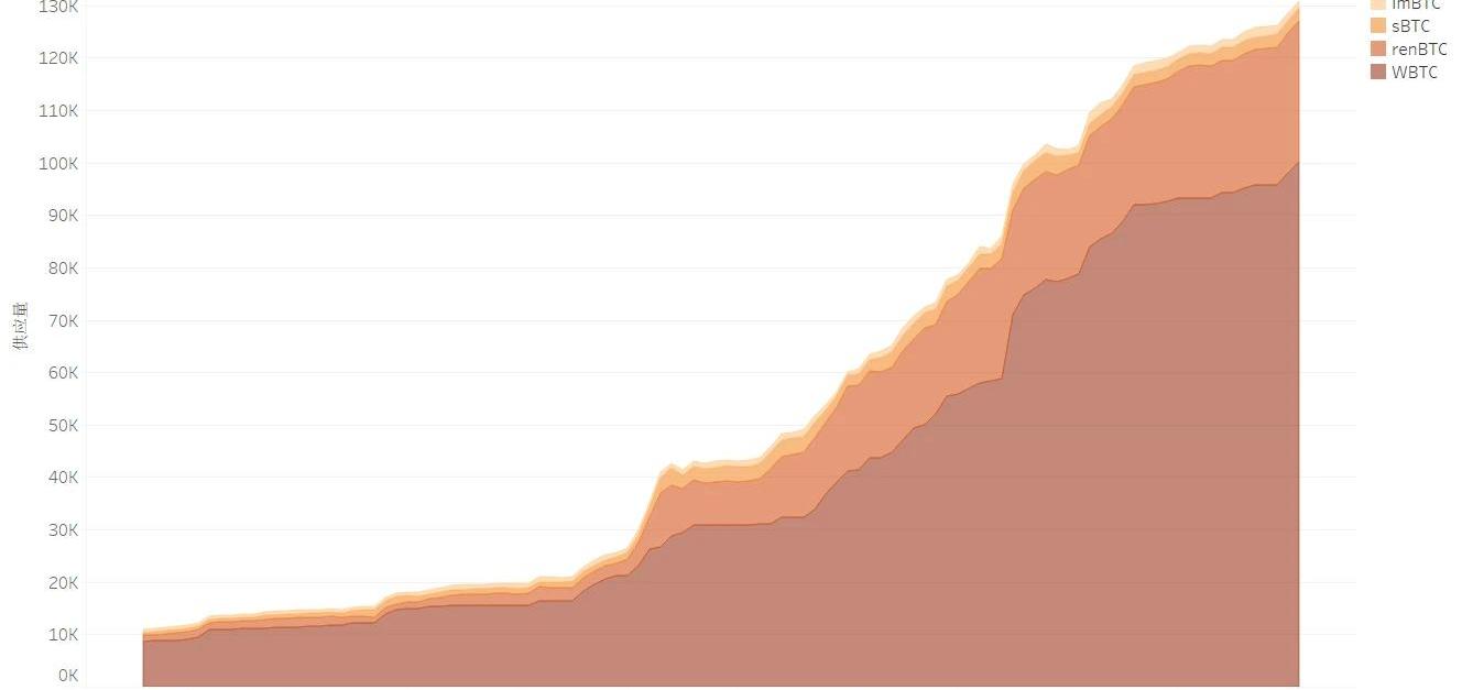 來源:QKL123,AMPLDashboard算法類穩定幣,也可以說是完全加密原生的去中心化穩定幣,AMPL是這個類型中的代表性項目。上圖為AMPL近90天的價格和供應量,AMPL有一個目標價格,如圖所示其目標價格為1美元,那么其名義匯率高于一定的閥值,協議就會同比增加所有用戶的代幣數量;如果AMPL價格低于目標價格一定的閥值,那么協議就會減少用戶持有的代幣數量。AMPL是加密貨幣創新的延續,它融合了比特幣和法幣的一些特性,但由于其特殊的供需調節機制所在,價格波動和供應量變化會特別大,會成為投機者的套利標的之一,短期內不太可能成為穩定幣,其愿景是在短期內試圖成為跟其他加密貨幣相關性不高的資產,中期目標是成為DeFi基礎組件之一。2.4.2BTC錨定資產圖2-9BTC錨定幣供應量