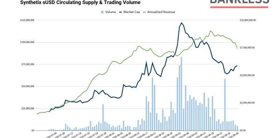 Defi衍生品協議季度收入情況,數據來自TokenTerminalSynthetix在9月末時,其sUSD發行量為7300萬美元,較本季度初增長266%。盡管sUSD的峰值發行量達到了1.22億美元,但它仍落后其它競爭對手,比如Dai的發行量接近10億美元,而USDC的發行量則接近28億美元。