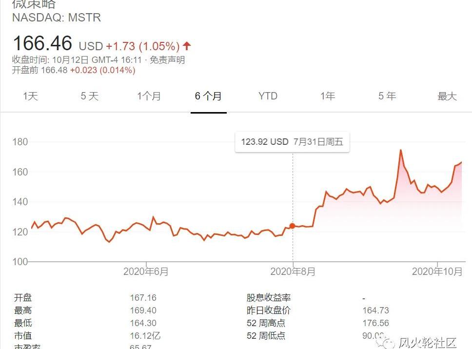 公司信息從六個增長到了十五個,總持倉量增長到60萬枚btc,占比特幣總量的2.86%,當然這里面只是一個信息統計的增長,并不是說在這一周增加了多少。這個數據還只是目前一些公開的,顯然還有很多略隱秘的長期倉位,比如blockone一年多前聲稱持有的14萬幣現在也不知道是變少了還是變多了。雖說這里面有很多配置是走的場外,比如之前我們介紹的square入的那5000萬美金,還有像這里面最大持倉量的灰度,里面有很大一部分入場的幣可能來自借貸(借貸參與灰度一級私木,鎖定期結束后二級市場拋售套利),他們并不會真正對市場產生過大影響。但不管怎樣,他們也相當于鎖住了部分流動性,要知道這樣的“大戶”一般配置了是不會在短期拋售,另外可以看上表中應該說90%的幣都是在今年買入,如果這只是一個開始的話。。還是有一定想象空間的。需要注意的現實:(1)可以注意下這些公司的名稱,除了灰度這類機構,很多都是本身就是圈內企業,像上面帶blockchain的啊,還有挖礦的像HUT8,RiotBlockchain這些,另外square這些也是在賺著幣圈的錢的,這些持倉本無可厚非,所以是不是真的受什么海外上市企業的青睞,可能還需要再多觀察一段時間。(2)他們未必真的那么看好,而是在打自己的小算盤。之前提過的那個微策略公司,倆月囤了3萬8千枚,而這一操作帶來的是股價從7月底的123U漲到了現在的166U,增長了34%: