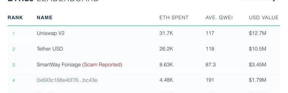 在GasNow推出之前,ETHGasStation一直都是各個錢包或者業內主要參考的「建議Gas價格」來源。但除此之外,ETHGasStation統計的各個應用或者智能合約的Gas消耗量也是一個值得參考和研究的數據。