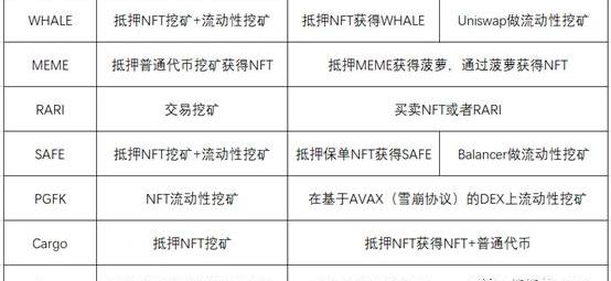 如表格,NFT+Defi可以分成三類:第一類,和NFT本身無關,純Defi方式的流.動.性or交.易.挖.礦,比如WHALE、RARI、SAFE等;第二類,本身純Defi挖.礦,后續加入NFT概念,比如MEME、Dego、BAKE等;第三類,質.押NFT挖.礦,或者將普通代B放入NFT中,再獲得其他代B,比如WHALE、Cargo等。第一類和NFT關系不大,下面重點講一講第二類和第三類。二、各類挖礦詳解