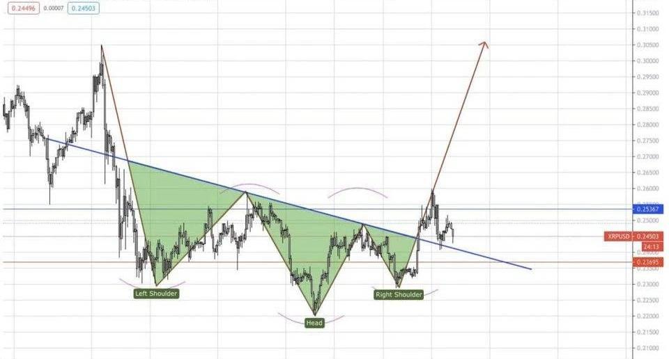 XRP/USD–previouswedgeXRP的另一個形態如果我們往下看小時圖,XRP有一個明顯的形態,即H&S;形態。這個H&S;形態是倒置的,所以說這個形態是看漲的。H&S;形態,以及看漲的下降楔形的看漲突破,應該可以成為XRP的跳板。