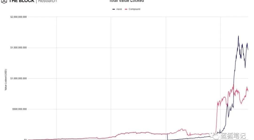Compound上未償債務規模是Aave的3.6倍,不過在鎖定資產量層面Aave高于Compound。