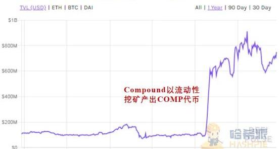 DeFi項目從2017年7月至今的總鎖倉量變化情況市場六月份的暴漲離不開借貸協議Compound的功勞。該項目自6月16日宣布以流動性挖礦產出治理代幣COMP后,提供該幣種交易的二級市場迅速從去中心化交易所蔓延至中心化交易所,包括Poloniex、Coinbase、幣安在內的70多家交易平臺相繼添加對COMP的支持,代幣產出不到一周時間就實現逾3.29倍增長。隨后近一個月時間里,Compound更是引來超10億美元的鎖倉量,相關數據的增長數值比2020年年初整個DeFi市場的總鎖倉量還要高出48個百分點。