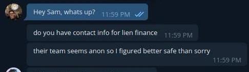 我迅速看了一下將ETH轉出的代碼,發現了兩個匹配項。其中之一將ETH轉移到了硬編碼的代幣地址,因此可以忽略。第二個是將ETH轉移給發送方的焚毀功能。在跟蹤了此功能的用法之后,我發現任何人可以免費為自己鑄造代幣,然后將其焚毀,換取該智能合約中的所有以太幣都是不費吹灰之力的。我的心跳加速了。突然,問題變得嚴重了。我那份智能合約是LienFinance協議。不幸的是,他們的團隊是匿名的!唯一的即時訊息支持平臺是Telegram,而我不確定該Telegram頻道的管理員是開發者還僅僅是某些早期支持者。我可萬萬不想將這一漏洞意外透漏給錯誤的人。在他們的網站又多瀏覽了一段時間,我發現他們曾與ConsenSysDiligence和CertiK合作,接受其代碼審計。這看起來像是很不錯的途徑,ConsenSysDiligence和CertiK在審計期間肯定和開發者進行過互動。我迅速在Telegram上私聊了ConsenSysDiligence的安全工程師JohnMardlin。