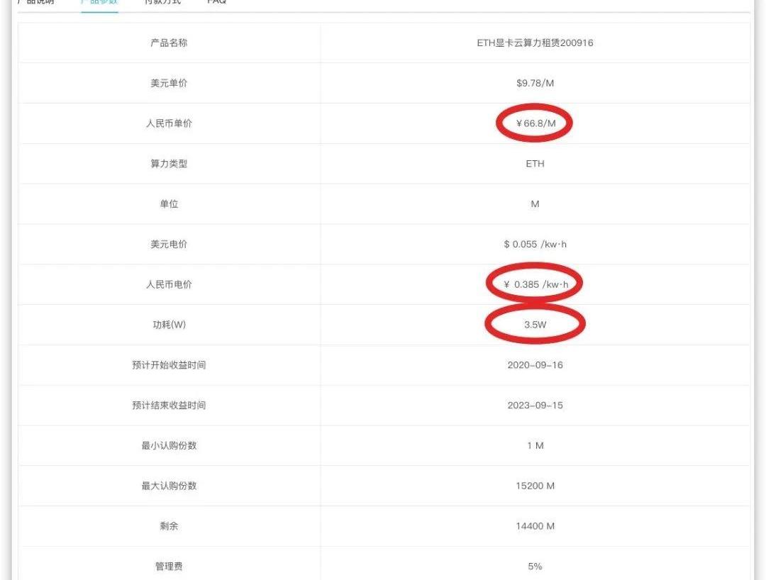 圖:某平臺推出的以太坊云算力產品云算力挖礦雖然簡單方便、省時省力,但也有很多缺點和風險。首先,是平臺的風險。云算力平臺良莠不齊,一些平臺自身并沒有實際控制的礦場和礦機,從本質上看它們就是二道販子,還有很多平臺規模小,風險承受能力弱。這樣的平臺,倒閉、跑路的風險非常大,尤其是幣價暴跌、發生“礦難”的時候。其次,云算力的溢價很高。挖礦是非常講究成本控制的行業,云算力溢價高,所以相比于其他挖礦產品,云算力的回本周期偏長。以某平臺推出的ETH顯卡云算力為例,每MH/s算力的價格是66.8元,電費0.385元/度,功耗3.5W。我們再對比一下聯合挖礦的成本,萊比特旗下的必挖上周推出的藍寶石5600XT8卡整機,算力320MH/s,價格20300元,折合每MH/s算力的價格為63.4元,電費為0.38元/度,每MH/s算力的功耗為3.44W。顯而易見,云算力產品的成本要高于聯合挖礦產品的成本。
