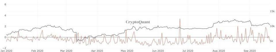 Miners'PositionIndex(MPI)為礦工頭寸指數,可以看出礦工對短期比特幣價格走勢的看法。MPI指數高于2,表明礦工在挖礦后傾向于出售比特幣;如果MPI為負值,則表明他們對短期走勢的看好,選擇囤積比特幣。從下圖可以看出,2020年上半年,礦工僅在3月和5月出現過兩次短暫的出售意向,其余時間的MPI指數基本一直低于0;不過在進入七月以后,MPI指數多次站上1.5,尤其是在比特幣價格為11500和12000美元時礦工都展現出了非常強的拋售意向。