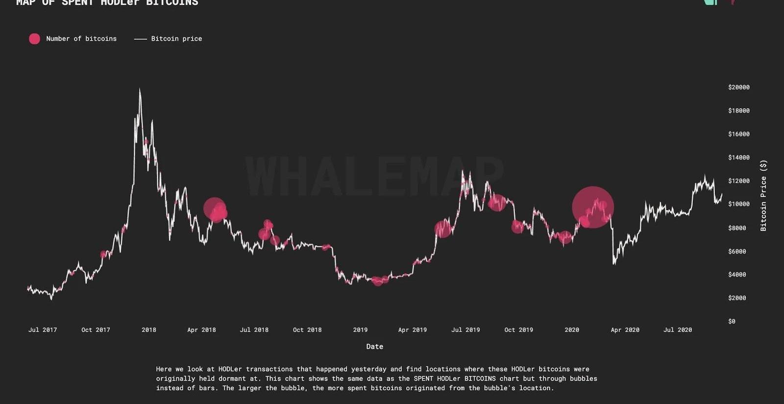 由于數據顯示,某些以9800美元購買的鯨魚可能正在準備出售,因此可以說支撐位已經減弱。但是,減弱的支撐位是否意味著BTC將跌至9800美元以下,則是另一種情況。9800美元的支撐位比以前弱了,但這并不一定意味著BTC因此會跌破這個價位。如果其他鯨魚將BTC推低至9800美元的支撐位,則短期看跌情況可能會出現。只有這樣,弱支撐才能在短期內放大BTC的下跌。如果比特幣在不久的將來不會跌至1萬美元以下,那么支撐位本身就變得不那么重要了。當鯨魚將BTC從錢包中提出時,Whalemap圖表上的紅色氣泡就會增加。研究人員解釋說:“紅色氣泡顯示的是這些人在交易比特幣之前最初持有比特幣的價位。想象一下,你在2萬美元的峰值時購買了比特幣,昨天你決定把它們轉移到一個交易所。在這種情況下,2017年峰值的紅色泡沫將出現。”在短期內,看跌BTC的理由是,在9800美元買入的鯨魚在1.1萬美元以上賣出,將價格拉回至1萬美元以下。8月23日,Cointelegraph報道稱,在2018年末購買比特幣的鯨魚在持有其BTC兩年后賣出了。此后,比特幣價格在各大交易所從1.25萬美元暴跌至9800美元。與八月下旬類似,比特幣在1.11萬美元處內面臨巨大阻力。鯨魚在當前價位的拋售可能引發大規模回調和強烈的市場反應。備受期待的CME缺口也出現在9600美元處,而拒絕1.11萬美元可能導致機構試圖靠近這一缺口。交易員怎么看?
