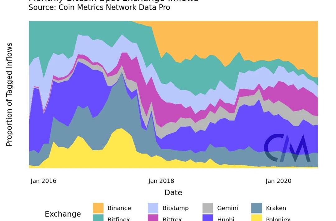 分析市場集中度的一個有效指標是Herfindahl-Hirschman指數,該指數隨著市場的壟斷性的增加而增加。雖然我們的估計會受到幸存者偏差的影響,但在過去一年中,CoinMetrics覆蓋范圍內的BTC/美元現貨市場的HHI一直保持平穩。目前,根據這一指標,我們認為市場是適度鞏固的。除了報告的交易量外,鏈上持有量還可以從另一個角度窺見行業狀況。CoinMetrics的交易所流量所追蹤的現貨交易所的比較余額如下所示。由于Coinbase避免了熱錢包地址的重復使用,這些估計中明顯不包括Coinbase。