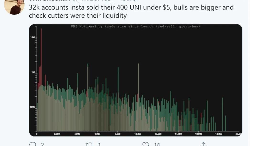 UNI免費空投給大家,然后又開始了挖礦,不少人都賣出去了。有數據統計3.2萬個賬戶中的400個UNI在5刀以下賣出去了。