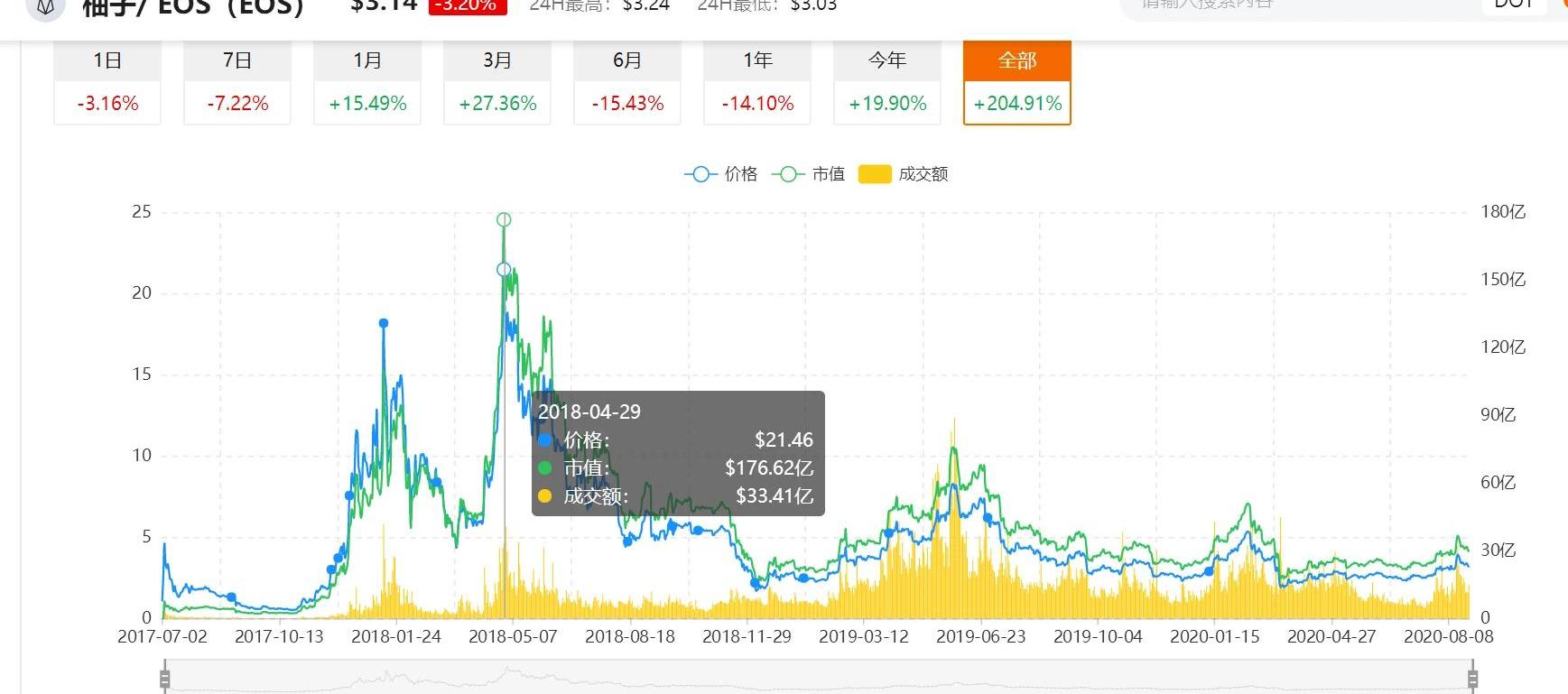 由于波卡拆分后總量10億,和EOS的總量相等。同時,波卡創始人GavinWood是以太坊的聯合創始人,聲望頗高。EOS創始人BM在發起EOS之前因成功締造了BTS、Steem兩個項目,也聲名鵲起。而且,而至都是市值TOP20的項目,所以,圈內有人將兩個項目相提并論。EOS被視為區塊鏈3.0,一線交易所、各路大V紛紛競選EOS節點。2018年4月,EOS主網上線前,市場上對EOS的熱度達到高潮。在各路資金的推動下,EOS最高漲至約22美元,市值達到176億美元。當時恰逢熊市,比特幣從2017年低最高約2萬美元跌至8000美元。所以,EOS的表現十分扎眼。當時有不少大V預言EOS價格“三浪打完看500”,然而,等到EOS在當年6月主網上線之后,便開始一路陰跌,目前價格只有3美元,市值也只有30億美元,排名第13。