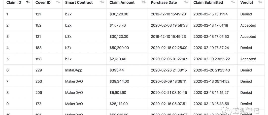 當然,因為用戶賺取了收益,也需要承擔義務。如果發生成功的索賠事件,該資金池的相應資金會償付給用戶,會使用ETH支付用戶的索賠,同時銷毀相應的NXM。如果用戶退出質押,則需要90天的鎖定期。社區用戶在NexusMutual的承保資金池中存入NXM。那么,用戶怎么獲得NXM代幣?要想獲得NXM,用戶在成為會員后,需要用ETH進行購買。也就是相當于向資金池中存入了ETH,從而獲得NXM。因此,NXM價值支撐也跟ETH價值的漲跌產生關系。*索賠評估如果某個DeFi協議的智能合約出現風險事件,購買該協議保險的社區用戶可以提出保險索賠。保險索賠由索賠評估師們進行評估。而成為索賠評估師也需要質押NXM。索賠評估師們也會獲得相應的獎勵。目前提出的索賠達到26個,通過的索賠為3個,23個索賠被否決。其中成功索賠的均為2020年2月份因bZx智能合約發生漏洞產生的賠付事件。賠付金額達到34,304.16美元。
