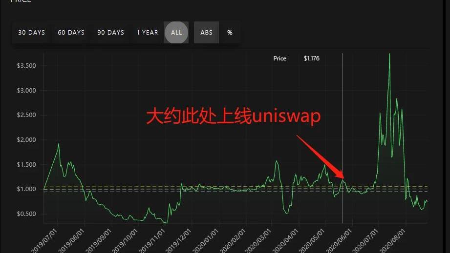 AMPL要起來,需要提高價值鎖倉和應用場景。目前DeFi里面的主要是交易、借貸、挖礦。對于AMPL來說,要進入到各DeFi協議里面,應用場景才會增大,AMPL才能更加壯大;而AMPL要進入DeFi各協議中,AMPL自身需要更壯大,才能被接受。而這個滾輪怎么推動呢?誰來推動呢?說這個之前,先回顧一下,AMPL上一波為啥能夠起來?AMPL從2019年7月份就上線,一直不溫不火,為何直到上線uniswap之后,開始第一波大風浪呢?AMPL上線uniswap之后,其價值鎖定的需求大大增加。AMPL在2020年5月18日上線了uniswap,在uni上的做市資金變化情況如下圖。