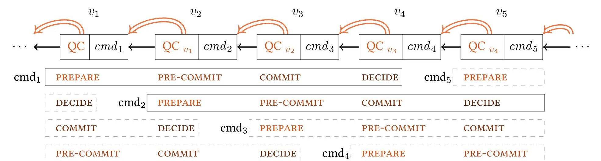 為了解決這一問題,HotStuff在PBFT的基礎上引入了鏈式結構。由于之前所說的鏈式結構的特性,一個節點對一個區塊的投票實際上是對這個區塊所在鏈上之前的所有區塊的投票。因此鏈式HotStuff縮減了不同的投票階段,只保留了統一的Propose-Vote的形式。如下圖所示。