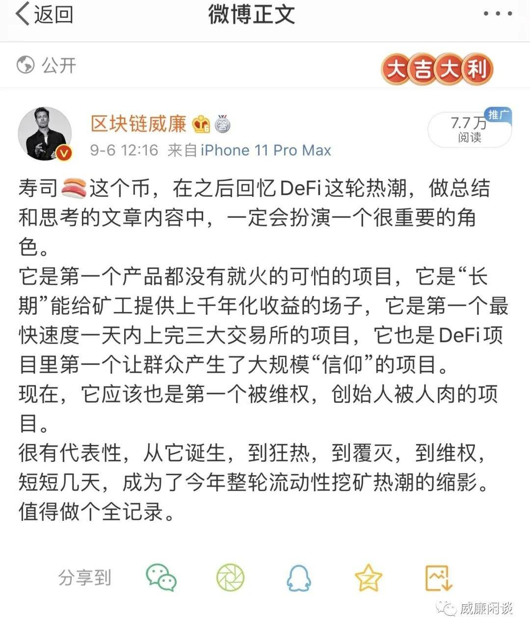 維權群在幣價反彈之后,瞬間成了信仰群。我不知道當年買壽司的人,還記得他們去中心化的夢想嗎?還記得他們想用DEX革命掉幣安嗎?真是人間真實啊,跌了就維權,漲了就真香,完全不管這個幣到底本身怎么樣。可能大家都清楚這玩意兒,本身真的不怎么樣吧。希望盡快能看到更深度的文章,能深扒一下壽司和各大DeFi生態項目背后可能的關聯和牽扯。當然,我是不會相信的,當故事會看也不錯。