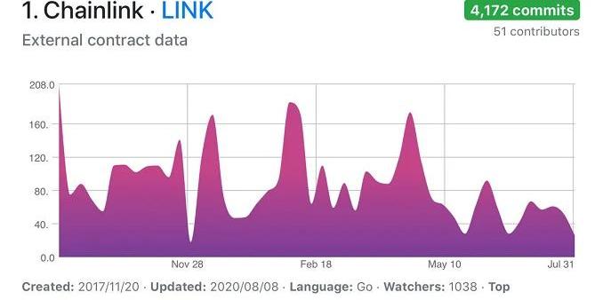 不過,還有一個問題縈繞在廣大投資者頭上:市面上不乏基本面好的項目,怎么就LINK漲得猛?可能有人認為LINK拉盤猛是因為莊家強勢,過去一年誰不說一句“LINK莊家牛”呢。莊家會選中一個幣持續拉盤的前提是,這個項目被其認為是“優質的潛力股”。從來都沒有無緣無故的拉盤,市場也往往走在大多數人前面。LINK的暴漲僅僅是因為莊家拉盤這么簡單嗎?其背后的原因可能有三:1.基本面良好,代碼庫持續開發,合作利好加持。LINK的代碼庫一直保持頻繁更新。據CryptoMiso網站數據顯示,過去12個月中,GitHub代碼更新最頻繁的區塊鏈項目就是LINK,51位開發者提交了4172行代碼。
