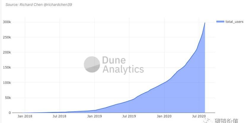 DeFi鎖倉金額|來源:Debank與此同時,DeFi市場的用戶總數也呈拋物線態勢上升。據DuneAnalytics統計顯示,截至8月1日,DeFi用戶總數接近30萬,相較6月15日新增約5萬人。