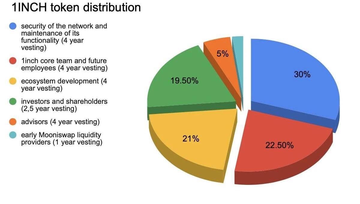 1INCH分配的最長釋放期限為四年。在這段時間內,分配機制將如下:30%的代幣將分配用于保護網絡安全性和功能性維護,分4年釋放;22.5%的代幣分配給核心團隊和未來員工,分4年釋放;21%的代幣分配用于生態開發,社區建設,科學研究等),分4年釋放;19.5%的代幣分配給投資者和股東,分2.5年釋放;5%分配給顧問,分4年釋放;2%分配給Mooniswap流動性提供者,分1年釋放。