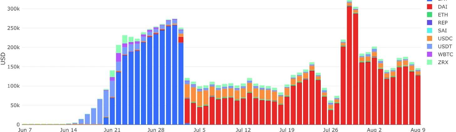 協議需要激勵更廣泛的協議產品,包括開發、管理角色和保險。與支付股息相比,對這些需求的分配,可以很好地促進長期資本回報率的提高。這可以通過分配現有現金流,或分配留存的協議資金來實現,但也可以通過在發行時稀釋未來現金流來實現。通過flop拍賣發行MKR是一種模型,其中稀釋被用作有效的無限制保險保障。獎勵協議升級貢獻者的Tezos風格發行,是稀釋作為funding的另一個潛在案例。可以想象,如果Compound治理者認為有益的話,他們也會添加一些類似的東西。流動性挖礦使用稀釋作為補貼供應方流動性,以及最終增加需求方量的一種手段。短期內,流動性挖礦在刺激需求方指標方面發揮了巨大作用,但其粘性究竟有多大,目前還沒有定論。