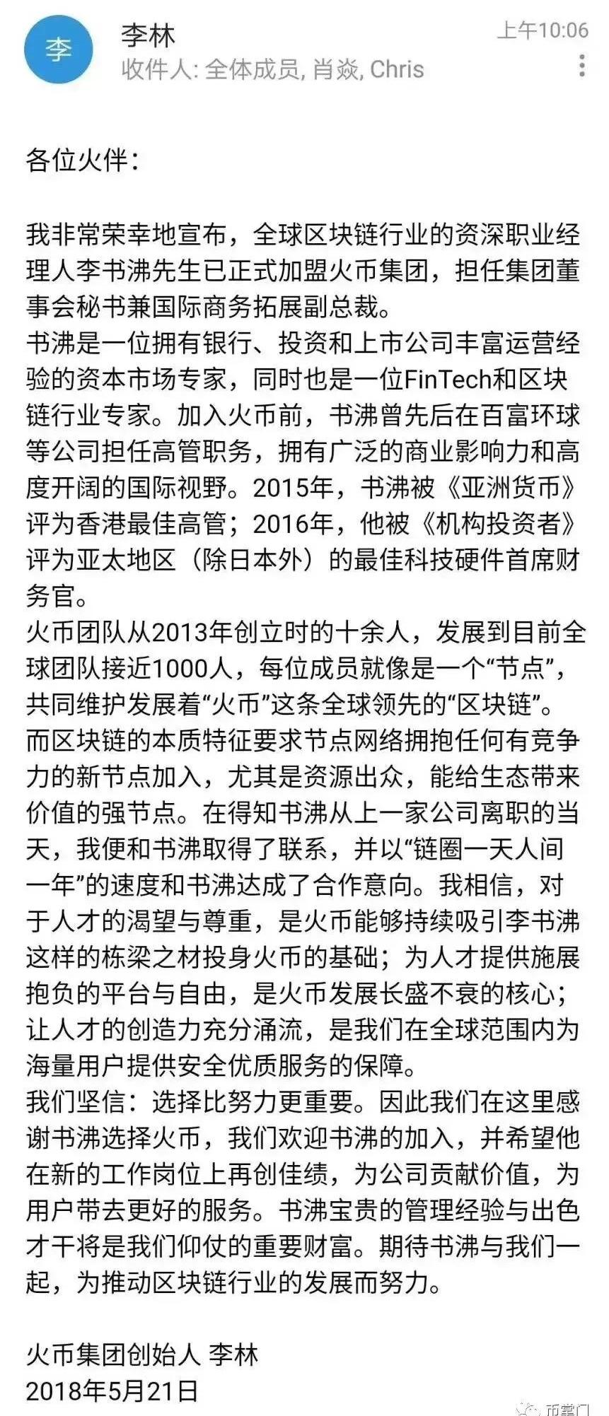 XRP/HKD-0.58%火幣集團高管近期變動頗多,新任CTO、CIO、財務總監陸續加入,CFO李書沸與上市公司秘書吳文謙宣布辭職。吳說區塊鏈在一周前已在坊間聽說這一傳聞。此事來得頗為突然,火幣集團官網尚未撤下李書沸的相關信息。李書沸曾擔任OKExCEO,18年5月加入火幣。