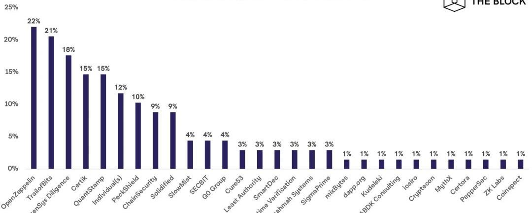 根據我們的研究,至少有29家網絡安全公司為加密貨幣項目提供審計服務,并延伸到DeFi項目。按審計的項目數量計算,領先的DeFi審計機構是OpenZeppelin、TraiofBits和ConsenSysDiligence。