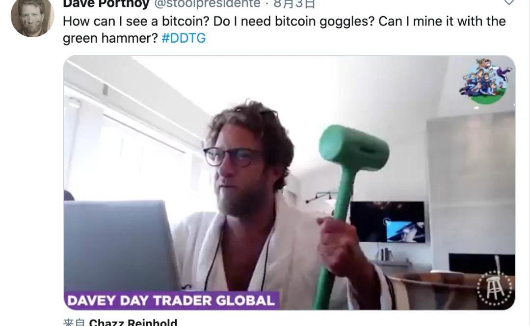 XRP/HKD-0.6%編者按:本文來自白話區塊鏈,作者:Fiona,Odaily星球日報經授權轉載。DavePortnoy是活躍在Twitter平臺上、因今年直播股票交易而大受歡迎的網紅交易員。他8月13號的視頻談到了比特幣,這次,他半認真半搞笑地問“我怎樣才能看到比特幣,用這個綠錘子能挖到么?”