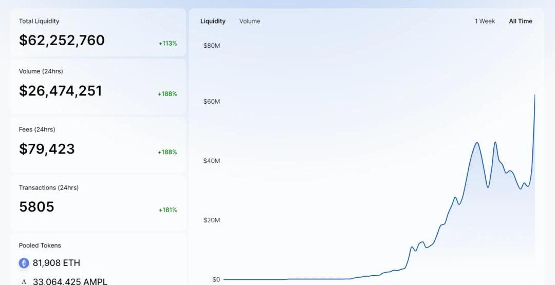 前幾天寫文章說《AMPL市值跌去了70%,底部到了嗎?加倉靜候狂風暴雨到來》,沒想到AMPL這么快就歸來了。而這里一個重要因素就是YAM,YAM刺激了AMPL,刺激效果如何呢?AMPL價格回到0.95附近,估計很快就看不到1刀以下的AMPL了,AMPL在uniswap上的資金池和成交量翻倍增長,資金池破新高。