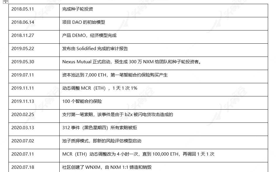 索賠評審員投票同意索賠,那么保險金額會發送至投保人地址,同時,保單中止,投保人的保證金也會返回。如果拒絕賠償,投保人的保證金將銷毀,但保單仍然生效,投保人還可以提出第二次理賠申請。但是,全員投票的結果具有最終效力,索賠失敗的投保人無法再次索賠。費用池的資產是保險費用的20%,由系統鑄造的。當投票結束后,所有投票者都將獲得費用池的獎勵,分配比例按票數占比。2.5.7治理NexusMutual的DAO治理部署在GovBlock平臺,該平臺由Somish,也就是團隊成員NitikaArora和IshGoel所屬的公司制作。NexusMutual有一個咨詢委員會,由五名成員組成:NitikaArora、RenisMelbardis、GraemeThurgood、NickMunoz-McDonald和IshGoel。通常情況下,治理的流程如下:1)會員提出提案;2)由咨詢委員會受理,將提案加入白名單,并設置投票獎勵;3)咨詢委員會投票,并為所有會員給出治理建議;4)所有會員投票,需超過15%。5)團隊執行提案。咨詢委員會成員可以使用緊急暫停功能,停止所有交易。所有咨詢委員會成員都同意只在極端情況下使用。緊急暫停允許在任何其他事務完成之前完成代碼升級。所有的代碼升級(在緊急控制期間之外)必須得到會員基礎的同意。咨詢委員會如果認為在索賠評估階段發生了舞弊行為,他們有權銷毀索賠評估員質押的NXM。總結:Nexus的團隊雖然人數不多,但是配置非常合理,既有保險精算師,也有區塊鏈多年從業者。代碼更新主要是印度區塊鏈公司Somish負責,Nexus團隊的兩名區塊鏈專業成員都是隸屬該公司,并且團隊的社區治理模塊也使用Somish開發的GovBlocks。NexusMutual的產品為智能合約保險,該產品的保險標的為智能合約,保險責任為:“代碼的非預期使用”。通過其KYC成為會員的用戶可以購買該產品。當指定的智能合約遭到駭客攻擊時,投保的會員可以進行索賠,從而挽回損失。會員可以質押NXM,參與索賠評估,獲取部分保費獎勵。另外最新更新的風險評估模塊,讓會員根據自己的風控標準對各個智能合約質押,在獲得保費獎勵的同時,為NexusMutual系統貢獻資本。Nexus的整個保險業務框架設計嚴謹,每個環節都和區塊鏈相結合。新的質押模型在當前的保險業務規模下,能提供的年化收益率非常有限,而質押者同時還需承擔本金損失的風險,所以該模型仍然無法吸引足夠的風險評估人質押NXM。基于該模型的新產品存在,因風險質押量不足,而無法開展業務的風險。3.發展