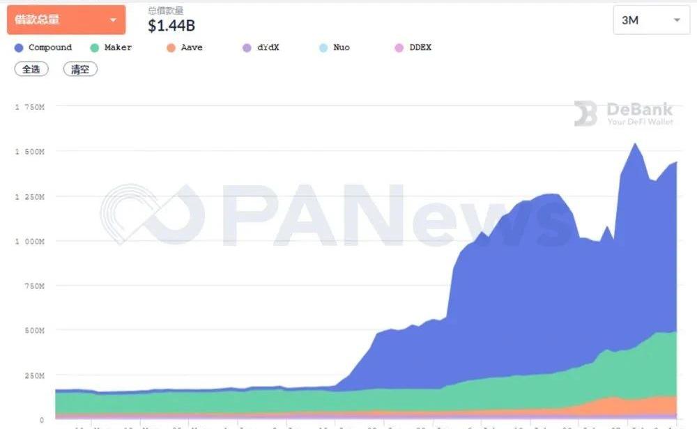 去中心化借貸市場在7月份繼續維持了非常高的增長速度,總借款量在這一個月內增長了121%。以太坊上的抵押借貸市場由Compound和Maker牢牢把控,這兩個平臺的市場占有率之和達到了90%以上。6月份才開始崛起的Compound,才是這其中真正的霸主。Compound中借貸量的增長并沒有引起投資者的熱情,在這一個月里,其治理代幣COMP的價格接近腰斬,創下新低。在上一個月的DeFi月報中PANews也提到COMP可能存在泡沫,前期流通量的不足可能過高的推升了COMP的價格。并且,借貸市場的借款或存款并沒能完全反應產品的使用情況。為了獲取平臺的治理代幣,同一個人可能對同一幣種進行反復存款、貸款。以DAI為例,目前DAI的總供應量只有3.8億,而Compound中DAI的存款就有10.6億,這意味著有相當多的DAI被用于在Compound中反復的存款、貸款。