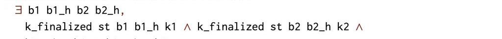 這個定義很簡單,只是說:如果安全性被打破,那必定意味著某個驗證者集合會被罰沒。這個證明機械化了Gasper給出的非正式論證,并展示了為什么分叉獲得終局化就意味一定有兩個絕對多數團體違反了其中一條罰沒條件,因此其交集可被罰沒。我們的技術報告描述了形式化過程以及這些屬性的證明,而我們的項目代碼庫提供了完整的詳述。繼續前進