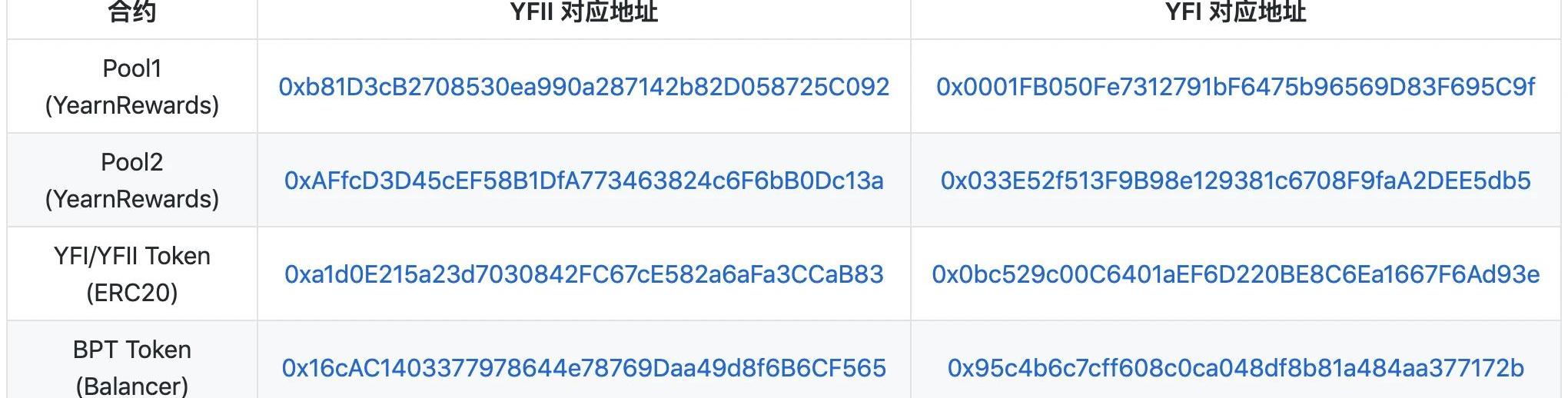 目前,YFII合約代碼均直接Fork自YearnFinance,做了較小的改動以支持YFIIToken的定期減半分發。下表為YFII涉及的合約與YFI合約對應關系及地址。