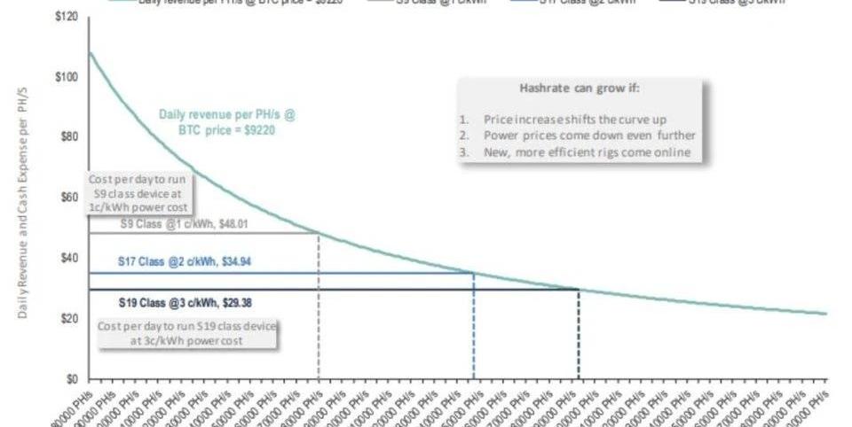 來源:BitOodaestimates,Blockchain.com,Kaiko,Coinmetrics挖礦得到的BTC以美元計算的價值,會隨著時間的推移降低,這使得盈利越來越差,除非BTC價格的增長足以抵消這一點。正如下圖所示,每PH/s每日賺得的收入是網絡哈希率和BTC價格兩者的函數。目前比特幣網絡哈希率目標值約為124EH/s,當前BTC價格為9220美元,每PH/s每日收入約為70美元。如果網絡哈希率增加至260EH/s,我們預期2021年夏天會達到這一數值,那么,BTC價格需要達到約19,500美元,每PH/s每日的收入才能維持在同樣的70美元。如果屆時BTC價格為10,000美元,那么每PH/s每日的收入將只有36美元。下圖中間的圖表顯示,高能效的S19級礦機在電費4美分/kWh的情況下,需要花費約37美元的現金費用就能實現1PH/s每日,但在電費4美分/kWh的條件下,運行S9級礦機,要耗費的成本則為133美元。即使BTC價格達到10,000美元,S9級礦機依然需要在0.5美分/kWh以下的電費下運行才能盈虧打平。圖:在未來哈希率和BTC價格的幾種不同情況下,每個礦機級別在不同電力價格下的每日收入和現金運營成本,注:在估算主動用于BTC挖礦的電力比例時,我們假設PUE為1.12