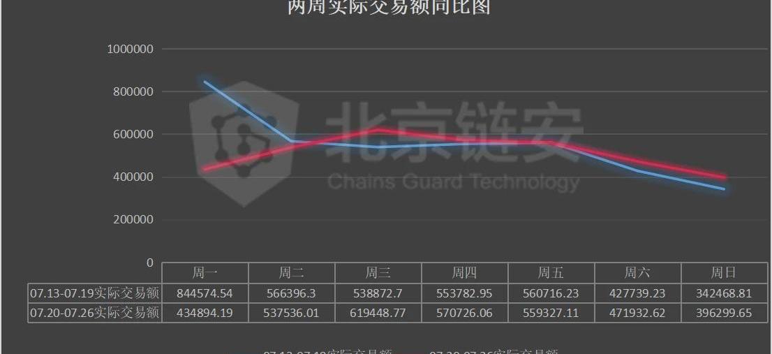 實際交易額:07.13-07.19:3834550.76BTC07.20-07.26:3590164.41BTC較之前一周下降:6.37%詳細數據圖如下: