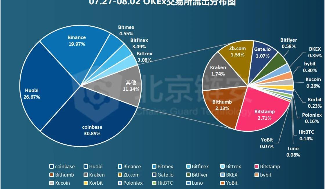 火幣的流入和流出節奏也與幣安相仿,但是整體變化更為穩定,同樣的凈流出額大幅減少,但是暫時未能改變凈流出的態勢。三大交易所流出分布:在過去一周,交易所之間的比特幣來往又呈現怎樣的分布呢?我們將幣安、火幣、OKEx三大交易所流出到各交易所的比例在這里也向各位呈現。