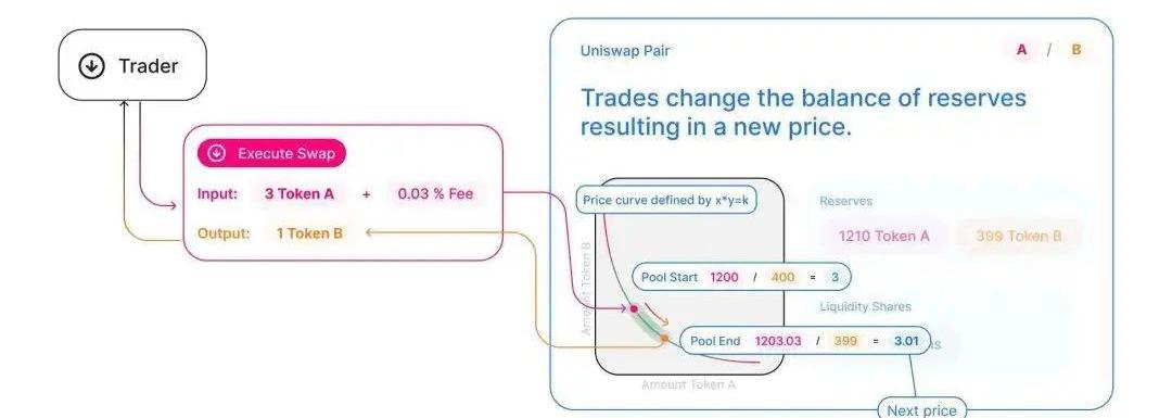 Uniswap是以太坊區塊鏈上的一個去中心化交易平臺,主要為ETH和ERC-20代幣提供流動性服務,是目前用戶數量最多的DeFi應用。Uniswap最大的特點是自動化做市商,用既定算法代替人工報價。這里簡單介紹一下它的自動化做市商算法:X*Y=K假設有一種ERC-20代幣叫BTOP,比特帥想在Uniswap上為ETH和BTOP的兌換提供流動性。假設ETH和BTOP的初始兌換比例是1:10,比特帥在Uniswap的ETH/BTOP資金池中,分別提供了10ETH和100BTOP。套用上面的公式X*Y=K,我們可以得到10*100=1000。老礦工小黑想購買BTOP代幣,于是他拿了6個ETH兌換。Uniswap的手續費固定為0.3%,6ETH需要扣除0.018ETH,這時資金池中的ETH數量變為了10+5.982=15.982個,常數K保持不變,則資金池中BTOP的數量變成了:1000÷15.982=62.57所以,老礦工小黑可以兌換到的BTOP數量為:100-62.57=37.43枚。兌換完成后,這筆0.018ETH的Uniswap手續費會注入資金池,這時常數K會更新為:*62.57=1001.12。下一筆交易兌換,將按照這個新的K值計算,以此類推。
