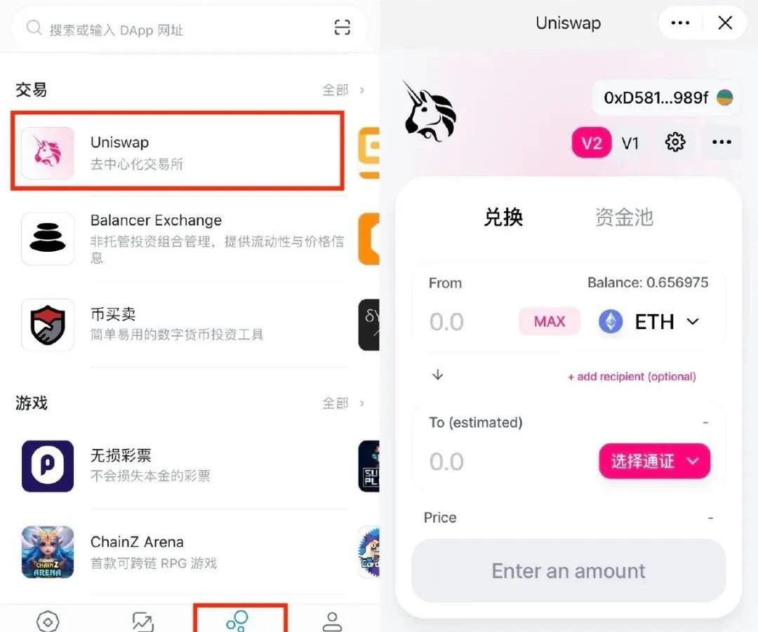 圖:Uniswap的自動化做市商算法演示需要注意的是,這個例子中的0.3%手續費最后是給到Uniswap對應的資金池,老礦工小黑支付6ETH時,還需要給以太坊礦工支付礦工費。所以,參與Uniswap流動性挖礦,收益就是Uniswap收取的0.3%的手續費。目前,很多錢包都支持接入Uniswap協議。下面,小編還是以imToken錢包為例,先手把手演示如何用Uniswap購買加密資產,然后再演示如何參與Uniswap的流動性挖礦。1、打開imToken錢包,在底部的「瀏覽」界面找到「Uniswap」,點擊進入。