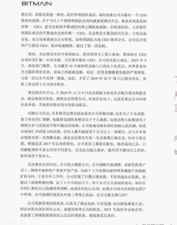 吳忌寒方面在做什么:1:核心是建立新供應鏈體系吳忌寒公告說:世紀云芯的管理層更換,標志著公司與詹克團的關系進入了新一階段,決心促使礦機生產供應鏈盡快恢復正常,為此已啟動供應鏈二部運作,在世紀云芯經營管理秩序恢復前,替代世紀云芯原在集團體系內之角色。天眼查數據顯示,7月16日香港比特控制的北京硅原大陸科技有限公司新成立了一家深圳子公司:深圳硅基揚航科技有限公司。吳說區塊鏈獲悉,7月12日吳忌寒任命了深圳負責供應鏈、生產的新任負責人龍正祥。2:公開發布內容,影響輿論。讓員工與外界知道,詹克團領導下無法帶領公司取得成功。在告員工信中有以下細節::忌寒先生是公司001號員工,詹克團是公司002號員工。詹克團并未兌現對技術團隊的股權承諾,導致了第一代技術團隊成員,包括公司004號員工等人出走。:2018年中堅持投產在測試時即己發現缺陷的芯片,僅一個項目即浪費超過6億美元資金。他管理方式粗暴,動輒辱罵員工,很多同仁都有切身體會。2019年吳忌寒信守承諾退出,但詹克團運營下公司截至10月底的資金缺口已高達3億美元。另一篇同時發出的詳細文章中礦霸迷航|比特大陸自救史,透露出以下細節::BM1393芯片事件,更讓人匪夷所思。芯片專家詹克團在一顆已經失敗的芯片上大量投入資金,終于不負眾望再次失敗。從2017年到2018年,比特大陸至少有4次礦機芯片流片失敗,包括16nm、12nm和10nm芯片,其中16nm流片失敗了兩次,因此損失至少12億美金。附:吳忌寒致全體同仁書