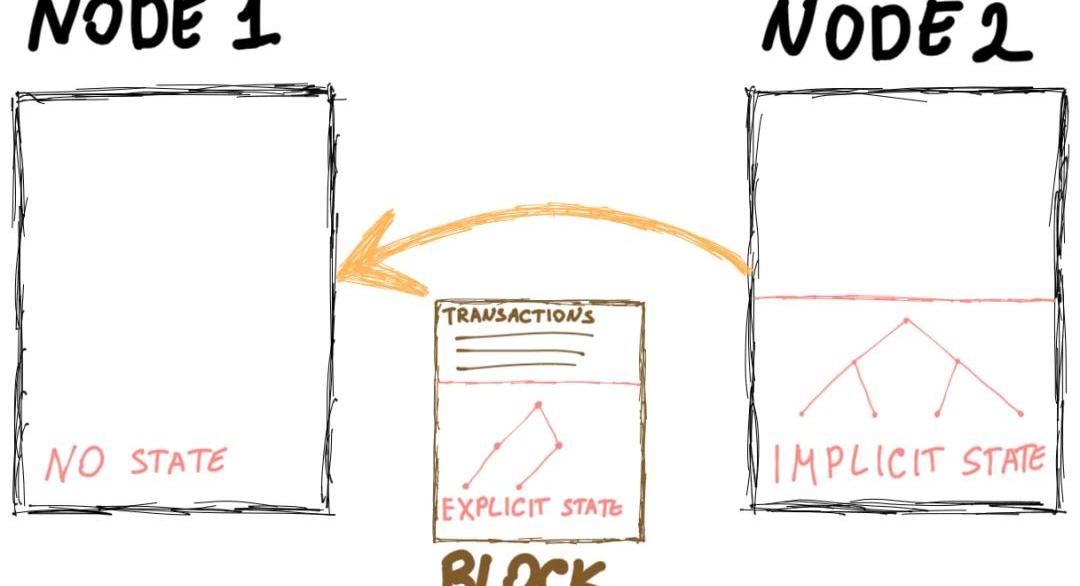 好了,現在我們都知道了,要將所有當前狀態清零,只保留根哈希。數據量從40GB減少到32字節。太棒了,硬盤空間省下了,但是我該如何發送交易呢?這時,無狀態以太坊就派上了用場。為了能夠運行交易,你需要提供見證。見證包含所用賬戶、代碼和合約存儲內容,以及能夠用來驗證根哈希的默克爾證明。然而,ReGenesis和StatelessEthereum之間有一個區別。在解釋這個區別之前,我想先介紹兩個術語:顯式狀態和隱式狀態。假設你在運行一個geth節點。無論你的對等節點何時向你發送了新的區塊N,該節點都假定你已經擁有了驗證該區塊內所有交易所必需的狀態數據,并且已經同步了區塊N-1。