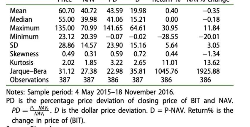 目前機構進入比特幣市場的最主要方法是通過Grayscale的比特幣信托基金,此基金專注于投資比特幣,因此它的NAV(NetAssetValue)就是追蹤比特幣的價格。科威特大學學者通過Bloomberg收集了此基金在2015年5月-2016年11月以來的的NAV表現,并研究了基金價格和NAV之間的價格偏差。通過對比特幣基金收益的統計學分析我們發現: