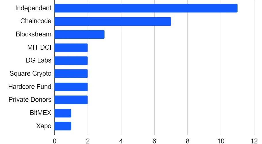 由不同機構支持的比特幣開源項目數量(Source:BitMEX)Blockstrams支持了8位開源項目的開發者。LightningLabs則至少有8位開發人員在使用開源Lightning軟件。對比特幣核心項目開發者的支持來源則更加的多元化,我們可以看到歷來在GitHub貢獻最多的33位貢獻者大多為獨立的開發人員。與此同時還有許多其他匿名貢獻者也無法輕易跟蹤。而ChaincodeLabs是比特幣開發中最多產的財務支持者。