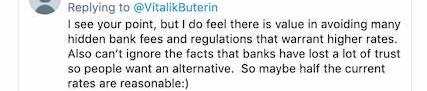 網友「cro36」認為現在的利率「有一半是合理的」,因為DeFi能規避掉很多隱藏的銀行費用和監管規定,而這些都會導致更高的利率。