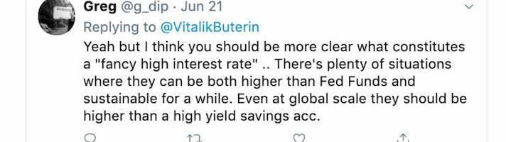 另有部分網友提出,這種「超高的利率回報」并非完全「不合理」的。加密投資者和開發者、EthereumPrice創始人表示自己只同意Vitalik所說的部分觀點,因為他認為傳統金融體系中利率很低是有原因的,反應的是整個支離破碎的體系的巨額成本,在該體系中,每一層的蛋糕都被很多人瓜分,但DeFi沒有這些。