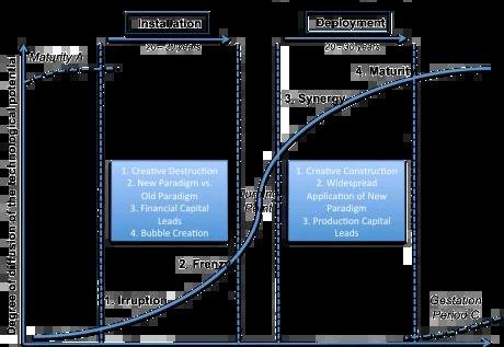 風險資產類別產生于早期那些沒有可靠的現金流、無法通過傳統銀行業獲得資金的風險企業。這創造了一種新的高度專業化的融資形式,更多地被理解為一種藝術而不是一門科學。這種新形式的融資基本上是為新技術的研究和開發提供資金,其投資者希望獲得超額回報。最早的風險投資公司——美國研發公司(AmericanResearchandDevelopmentCorporation),在其公司的名字里就有R&D(研發)。正是通過承擔這種風險程度,才使得這種10年期封閉式、流動性差的投資手段變得合理。要想理解投資者對巨額回報的追求,關鍵在于理解處于早期階段的技術市場,以及技術平臺所處的時機和周期。在這方面,卡洛塔·佩雷斯的「技術浪潮周期」研究有著重要意義。